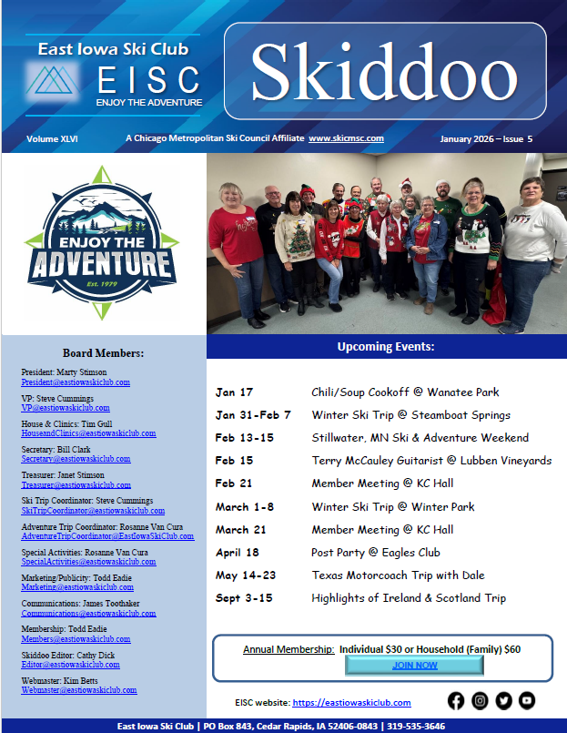 The East Iowa Ski Club is an all-around social club that brings together people who enjoy a variety of activities such as skiing, biking, hiking, kayaking, fishing or simply just touring and traveling. Our goal is to develop and promote exciting, new events in a spirit of camaraderie among current and new friends with common interests. As our logo says, "Enjoy the Adventure".